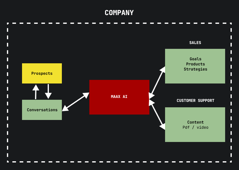 To craft a human-like response it is necessary that MAAX AI remembers past conversations with a specific prospect, as well information about that prospect. In addition, it has to understand what the conversation should achieve (goal): answer a question, persuade to buy a product, or convince someone to book a call with your team. \